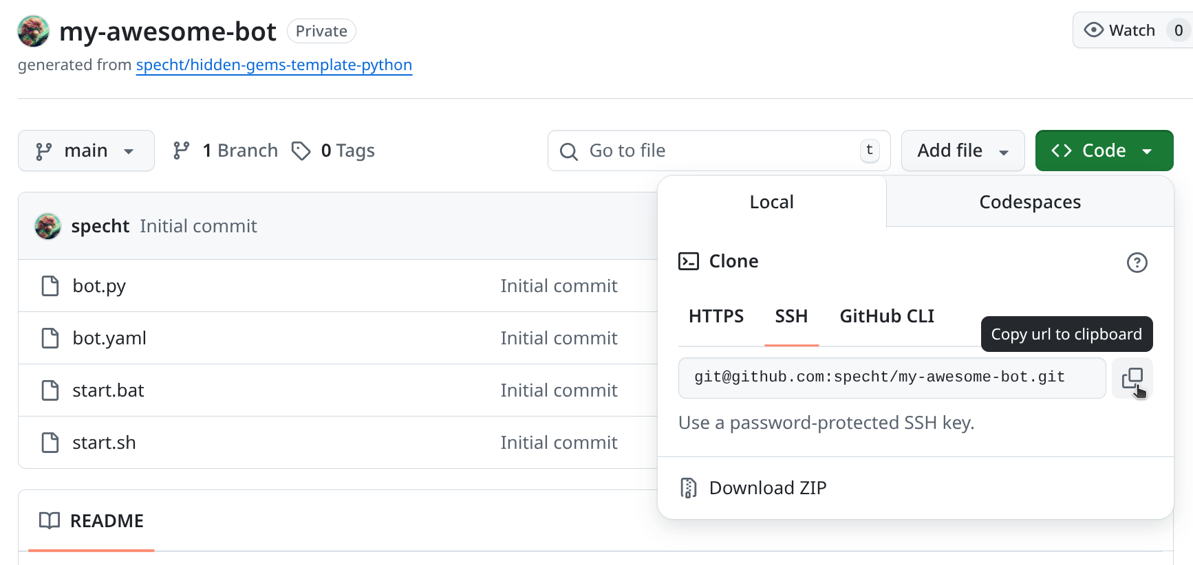 Es ist am einfachsten, wenn du deinen Bot in dein Runner-Repository klonst. Wenn dein Runner also z. B. unter /home/alice/hidden-gems