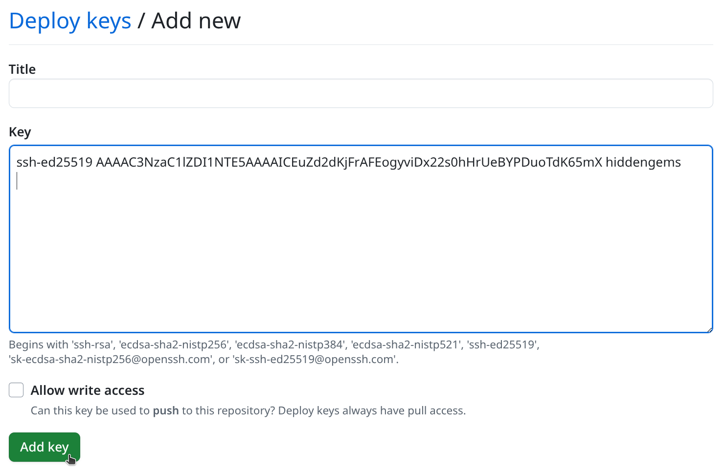 …und deinen kopierten Schlüssel in das Textfeld einfügst. Das Feld »Title« kannst du frei lassen, es wird automatisch befüllt. Achte darauf, dass du den Haken bei »Allow write access« nicht setzt. Klicke anschließend auf »Add key«: