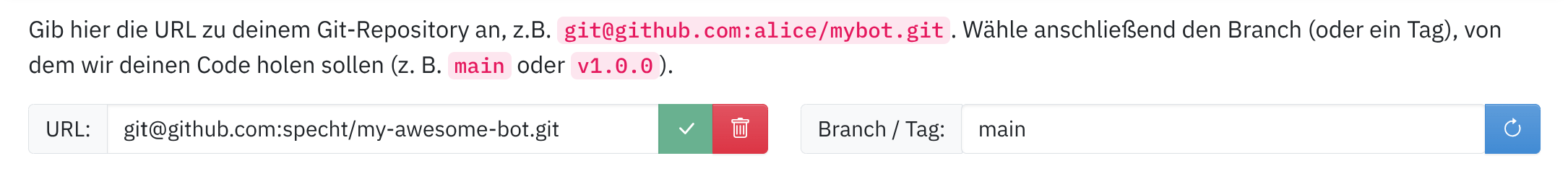 Füge nun die URL in dein Profil ein und klicke den grünen Haken. Wenn alles geklappt hat, solltest du rechts den Branch main