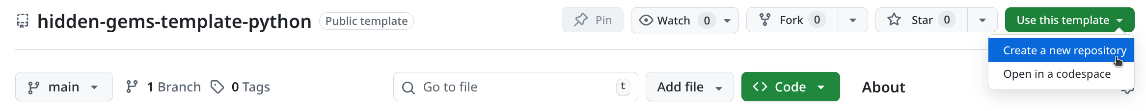 Klicke auf eine Sprache, um das Repository mit der entsprechenden Vorlage zu öffnen. Klicke anschließend rechts oben auf »Use this template« und »Create a new repository«: